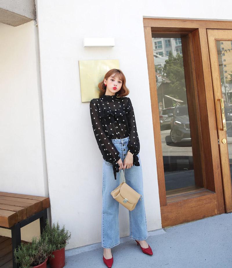 Một chiếc áo chấm bi tay thắt nơ, phối với quần jeans ống suông sẽ khiến nàng thôi thúc mọi ánh nhìn khi bước xuống phố.